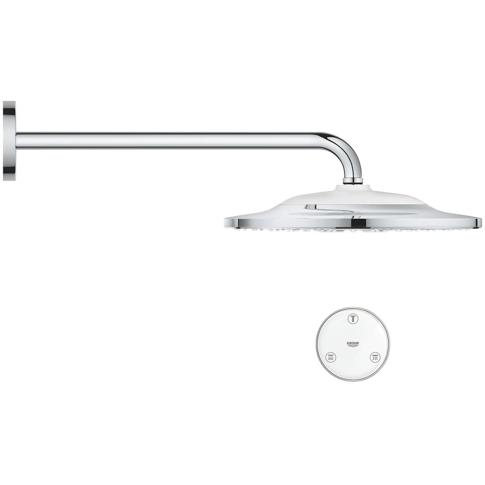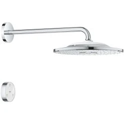 With a wireless remote control and a choice of versatile spray patterns, the Grohe Rainshower 310 SmartConnect head shower set makes an ideal bathroom update. The head shower has two different spray patterns β the gentle, relaxing Grohe PureRain spray and the invigorating Grohe ActiveRain, strong enough for rinsing out shampoo and targeted enough to offer a stimulating head, neck and back massage. These spray patterns can be used individually, or combined. Thanks to the showerβs innovative remote control, you can switch between the sprays without having to reach up to the shower head, increasing the comfort of your experience. The remote control has up to four-years of battery life, and can be placed in any position. With no mains connection or additional boxes required, this shower is ideal for retro-fitting. Included in the set is a round shower head and a horizontal 422mm arm for wall-mounting. Grohe DreamSpray technology ensures and even flow from every nozzle, and the SpeedClean feature lets you brush the nozzles free of limescale with just your finger. For a water-saving option, Grohe EcoJoy limits flow to 9.5 litre/minute with the same great performance. The showerβs good looks are also designed to last and last β the Grohe StarLight chrome finish is durable as well as dazzling. The super-insulated Inner WaterGuide channels hot water away from surfaces, not only making the shower touch-safe, but also giving greater longevity to the showerβs finish.